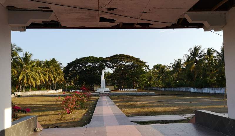 We nemen vanaf de hoofdweg bij madjene een afslag en rijden de dessa binnen, terwijl Andre vertelt dat het woord ‘kampong’ in de omgeving van Jakarta wordt gebruikt, terwijl in de rest van Indonesie deze woongebieden ‘dessa’s’ worden genoemd. Aan weerszijden van de weg staan huizen op verhogingen, zeer veel groen, veel kinderen,. Brommers ontwijkend zigzaggend de gaten in de weg. Een jongen van misschien 10 jaar rijdt op een crossmotor langs, een machete slingers aan zijn heup, meisjes kijken hem na. We zijn zes kilometer boven Madjene, er zijn soms lastige stukken in de weg. We stoppen bij het monument dat ik alleen ken van de televisie. Regisseur Erik Willems was hier destijds en maakte hier zijn schitterende tweeluik over de Zuid-Celebesaffaire.