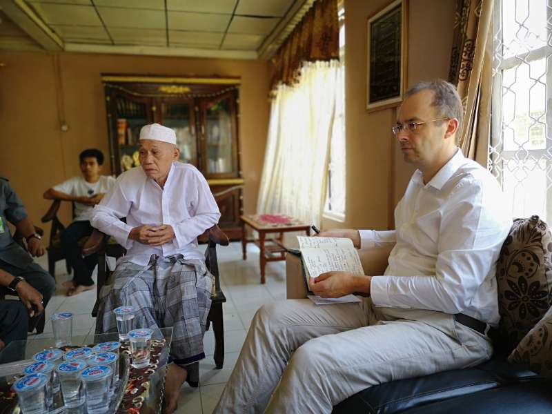 Pak Haji is hoofd van de geestelijken in de kampong, de Ulama’s Hij komt geregeld op de school tegenover zijn huis. Ook vertelt hij zijn kinderen en kleinkinderen het verhaal, maar het is lastig in te schatten of de kleintjes het allemaal begrijpen. Pak Haji lacht matig en beheerst. Ik meen in zijn gezicht diepe pijn te lezen.